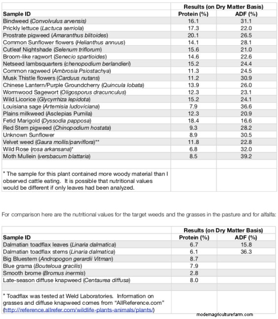 I collected samples of the plants and plant parts cattle were eating and avoiding. Protein values for their preferred weeds ranged from 12 to 22%. Since we know that animals can choose foods based on nutrition, it makes sense that they were avoiding the grasses with only 3 to 8% protein.