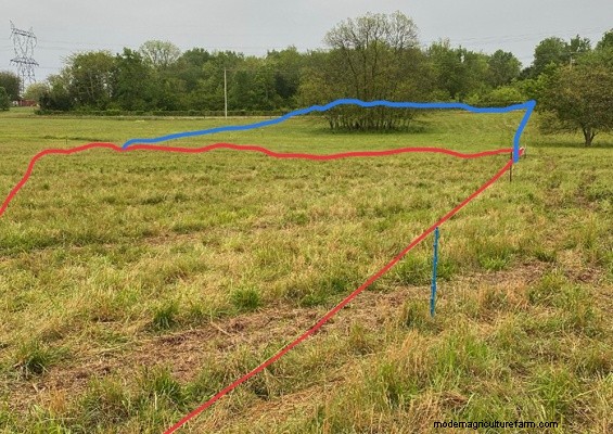 That is very helpful Troy and Greg. I’m currently running them through a new paddock everyday allowing them to back graze and get to water for 4 days. Then I move the water and start the 4 day cycle over. At least I’m doing something right! In this picture, red is where they were yesterday and blue is where I moved them to this AM. The stand of uneaten ‘grass’ is 8-12 inches. I’m trying to move them before they get the good stuff down to 4 inches.