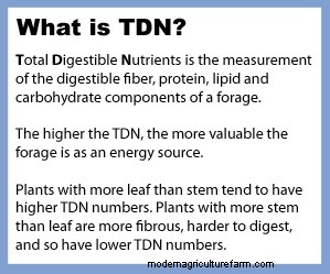 Forage growth is slow when plants are small and have few leaves (early spring growth or after grazing) and yield is low. As leaves get bigger, photosynthesis increases dramatically, allowing for rapid growth and increased yields. Prior to flowering, most pasture plants are growing as fast as possible if other factors are not limiting. As plants mature, growth slows since most energy is diverted to flower and seed production. While yield is highest at heading, quality is very low. Quality is high when plants are small and vegetative and declines as plants mature. This occurs because, as plants get larger and stemmier, a greater percentage of nutrients and dry matter is tied up in undigestible forms (such as lignin). Greater amounts of undigestible fiber result in lower quality forage with decreased amounts of total digestible nutrients (TDN).