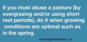 It is crucial, when deciding when to graze and how long to rest a pasture, that you move your animals according to the forage, not the calendar. If you graze too early, the pasture will be set back, desirable plants may die out, and weeds may take hold. If you graze too late, the grass becomes bunchy, loses palatability, and your production might suffer. There are times when you’ll want to purposely use shorter rest periods to weaken a pasture (say for interseeding legumes) or keep up with unusually fast growth. There are also times when you’ll need to use longer rest periods to let forage reseed itself, renew its root reserves, or be stockpiled.
