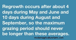 This is especially important for dairy farmers since change in forage quality shows up in milk yields. Many dairy farmers use one-day grazing periods; some move livestock after every milking. With other types of livestock, rapid moves are less beneficial and animals may be moved to new pasture every 2 to 6 days depending on the level of nutrition required.