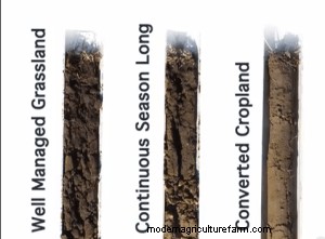 In their demonstration, one inch of water is absorbed into the well-managed pasture’s soil in just 10.1 seconds. Across the fence in the season-long grazed pasture, it takes the same inch of water 7 minutes and 3 seconds to absorb. Since some farmers are choosing to convert their grazing lands to corn production in South Dakota, they run the same infiltration test on grassland converted to cropland just 9 months earlier. It took 31.5 minutes for the inch of water to infiltrate.
