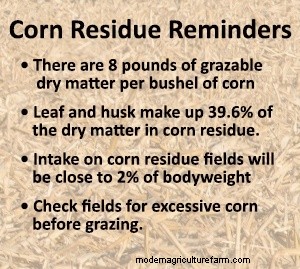 When thinking about how long to graze corn residue, the calculation to use is for every bushel of corn produced, there is 16 lbs of dry leaf and husk. The recommended grazing plan should be to remove 50% of the leaf and husk. This assumes that portions of the forage will also be lost to trampling, defecation, and other considerations such as wind. Now we have 8 lbs of good forage on a dry matter basis available for consumption for every bushel of corn.