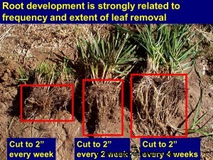 We can manage how much energy we’re collecting and storing in our plants and roots by how long or short we graze in relationship to where the sun is in the sky. Removing leaves means that the plant will draw on it’s batteries to rebound. The shorter you graze, the more of your batteries, or root reserves you use. And just like recharging any battery, the less energy it has stored, the more time it needs to recover. You can see the effect in the picture to the right.