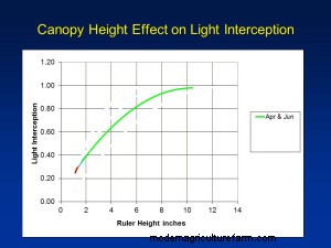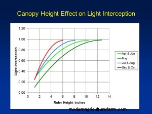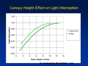 There’s a sort of trend here, with the light penetrating most deeply in the spring, and less deeply in fall. Here we’ve added the curves for July and August and September and October. Notice how the height of the canopy required to capture 90% of the suns rays decreases over the course of the grazing season. It turns out that the needs of the forage and the needs of the animals are well-suited to each other. Our job is to manage the time and timing in different pastures so that we’re keeping the solar collectors and their batteries in the best shape possible to do their jobs.