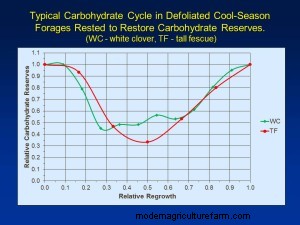 There is a point when it doesn’t do much good to have more leaf area. As leaves grow beyond maximum light interception they shade one another, and older leaves become less efficient and die. As leaf area increases, further energy reserves in the roots return to the high level needed to sustain the next growth cycle. Beyond this point net growth is reduced and forage quality declines. That’s why it’s important for you to graze the forage. You’re helping it achieve it’s maximum growth and health.