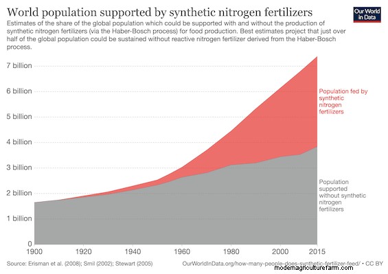 The Haber-Bosch process did exactly what William Crookes hoped and more. In fact, it’s estimated that about half the global population is supported by synthetic fertilizers. That’s 3 to 3.5 billion people fed thanks to the Haber-Bosch process.