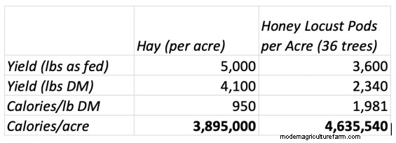 Now, let’s look at what kind of caloric yield comes from those 3,600 lbs of pods. The pods (containing 29% sugar) analyzed for Feedipedia contained 18.3 MJ/KG on a DM basis. Translate that to calories/pound for pods, and you get 1,981 calories/pound. Let’s assume that the 100 lbs of honey locust pods dropped from our 36 trees contained 35% moisture, so that each tree yielded 65 lbs of actual dry matter. That yields 128,765 calories/tree, or 4,635,540 calories/acre.