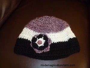And here's an adult version. You can do stripes, I actually didn't have enough yarn to do all purple, so I used scraps. Buttons or jewels look cute in the center of the flower. You can change yarn to do an outer edge in a different color, or do two flowers and then layer them.