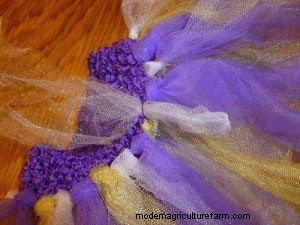 Continue to pull through and tighten. Make your way all the way around and ta-da! You have a no sew tutu! If you like it really full, you can add another row of tulle directly above the first row.