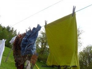 Here's a few tips when hanging clothes on the line. I hang all pants and shirts from the hem. This leaves no clothes pin marks on the shoulders and collars. The weight of the waist keeps pants from looking wrinkled and allows the thicker waistband to dry completely.