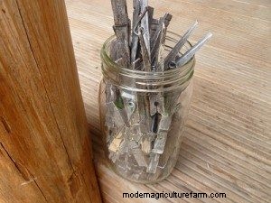 I use an old wide mouth Mason jar to hold my clothes pins. It's both decorative and functional.