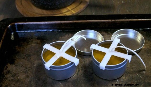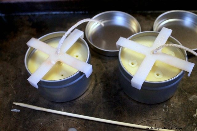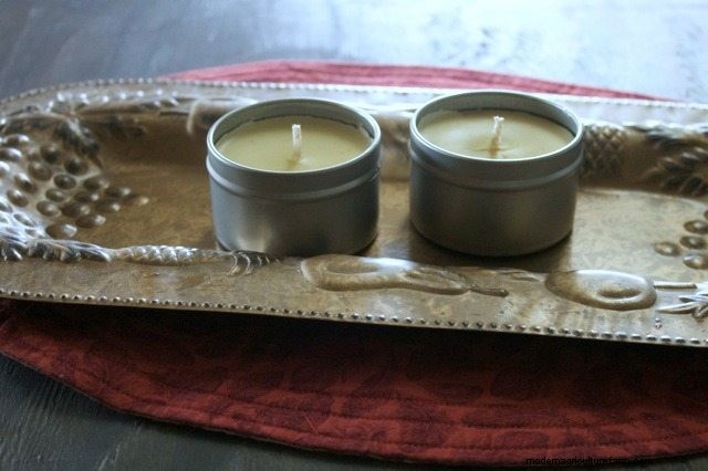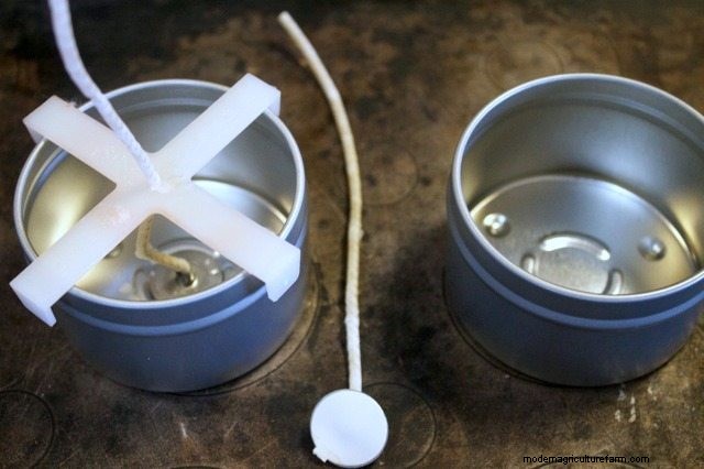 I tried making beeswax and beeswax/coconut oil candles in glass jars and every single time the wax split in the jar, leaving unsightly cracks. Then I happened to see some container beeswax candles at a whole foods co-op and they were all in metal candle tins. I figured if metal candle tins were what the pros used I should try it out – no more cracks…:). This is probably because the metal allows the wax to cool more slowly. Candle tins are pretty inexpensive and can be re-used. They also have centering marks so you know where to place the wicks.