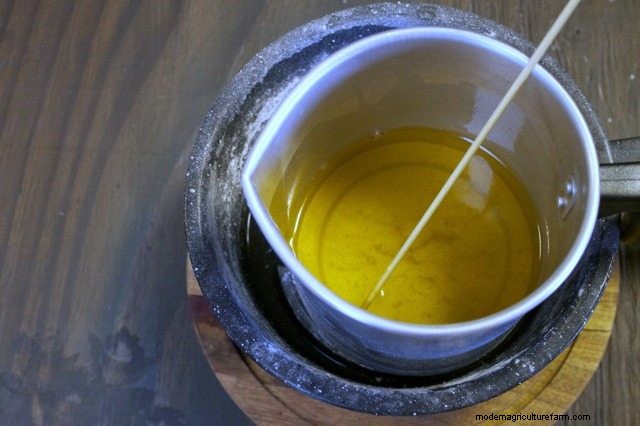 7. Place the left-over candle wax back on the burner (in the double boiler pot) and melt again.
