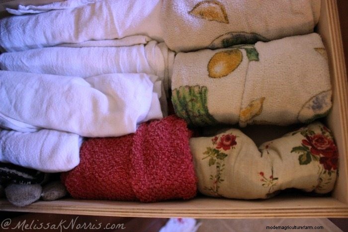 I have a drawer near the stove and fridge I keep my tea towels and hand towels in. During canning season I use three hand towels at a time. Any baker knows, tea towels are a wonderful thing for allowing dough to rise, draining whey, keeping breads and baked goods covered while cooling, and just about anything in between you can think of.