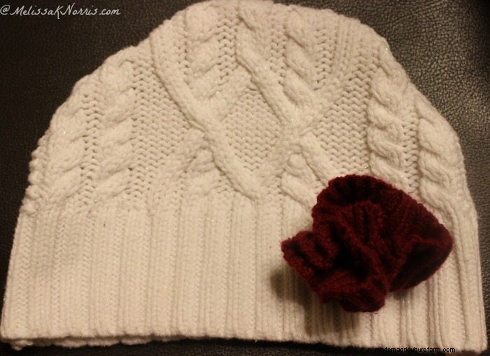 I took a sweater of my daughter's that was in the donation bag, and made a hat for me and boot socks for her (a Christmas gift). I simply took a hat I had, laid it on top of the sweater bottom, and cut around it, leaving enough of the sweater for seam allowance.