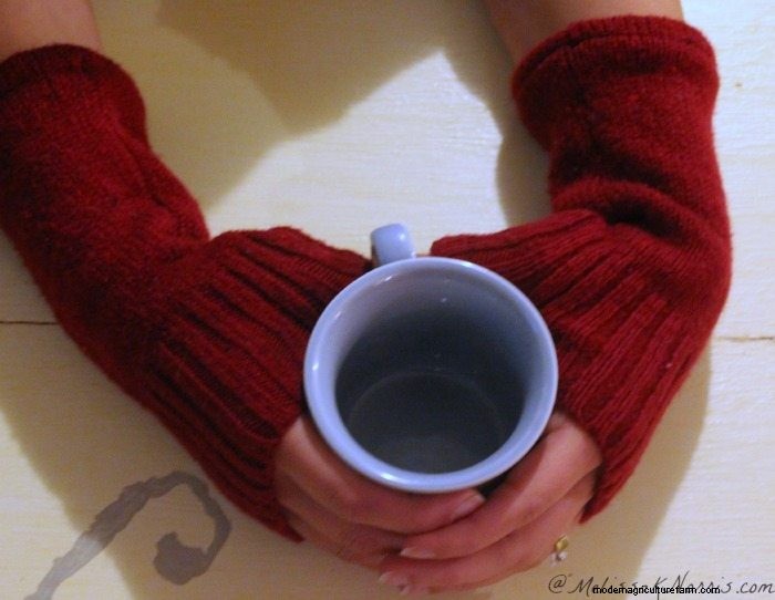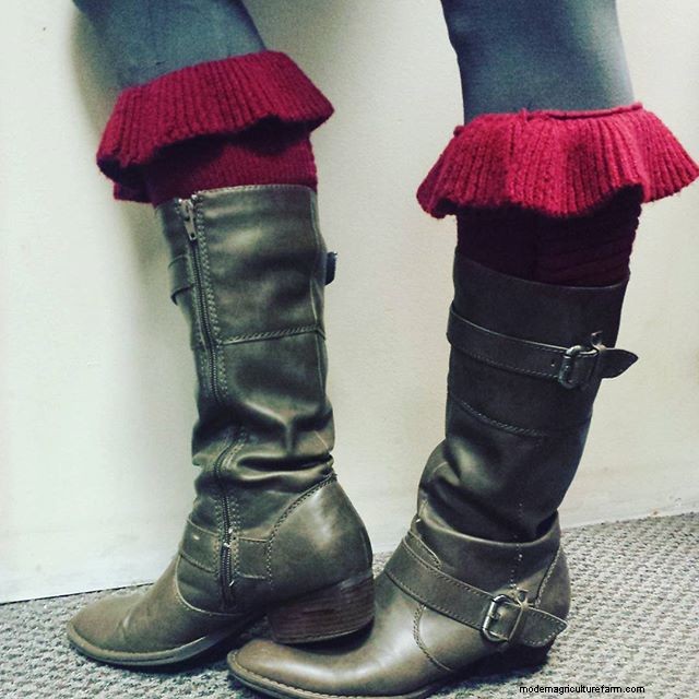 The ruffled hem of the sweater made darling toppers for boot socks. Basically, you just use the sleeve of a sweater for the part that peeks up above your boots. I hemmed the bottom and sewed a straight seam up the side.