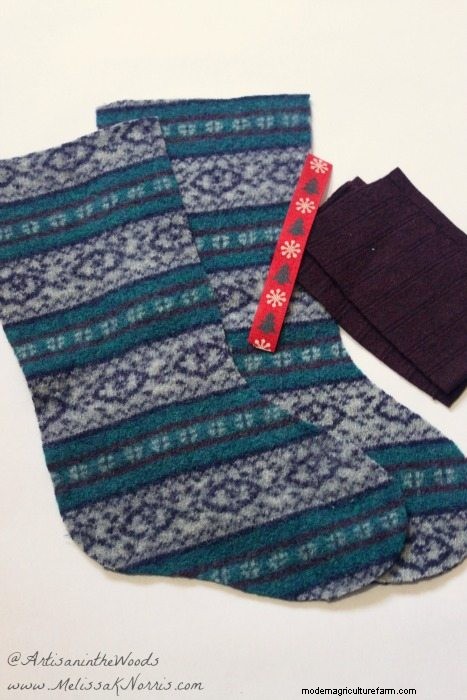 From the second sweater, cut 2 rectangles 4.5″ tall and as wide as the top of your stocking pattern.