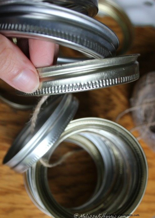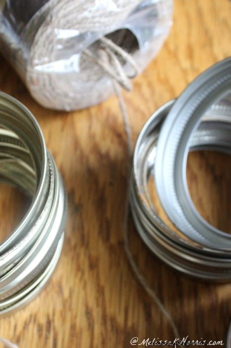 Take a length of jute twine and begin sliding the canning rings onto it. Make sure they're all turned the same direction.