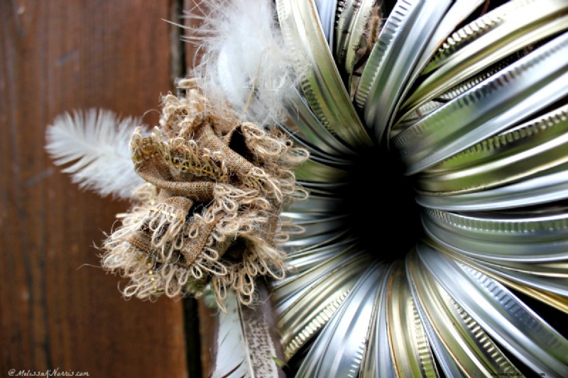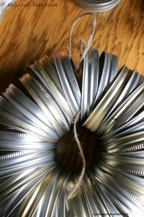 When all of the the canning rings are threaded onto the thread, join the two ends of jute twine together and tie tightly into a bow. Use the two loops of the bow to hang your wreath.