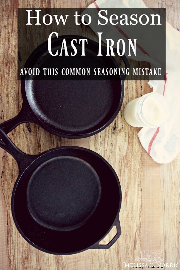 - Apply a THIN coating of oil all over the cast iron, inside, out and include the handles. The best way to season cast iron is thin layers and do it multiple times rather than once with a thick layer (that's you end up with gummy and sticky cast iron). You want a thin layer, if you go too heavy you'll end up with sticky areas on your cast iron. We don't use hydrogenated GMO oils in our house and you don't need Crisco, canola or shortening to get a good seasoning, trust me. People have been using cast iron way before any of these icky things came on the market or into our food supply. See my favorite best oils to season cast iron with below.