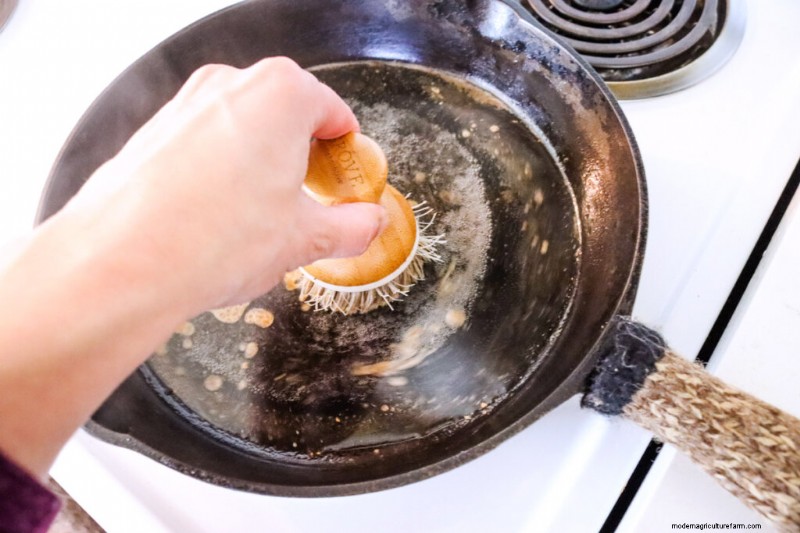 If you happen to have a grease-filled pan with food particles that has sat overnight in your cast-iron pan or Dutch oven, simply place it back on the burner to warm it up and add a thin layer of water to the pan. Allow it to come to a simmer then scrub with a rough scrub brush.