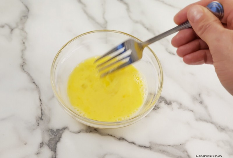 - Add 2 Tablespoons water to the eggs and whisk well with a fork or tiny whisk.