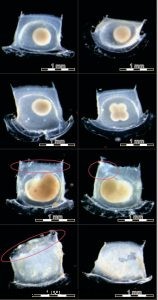 The hatching process seems to involve the dissolution or splitting of a “mucoid plug” or “seam” at the top of the capsule.