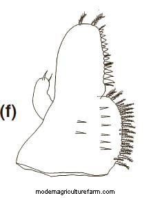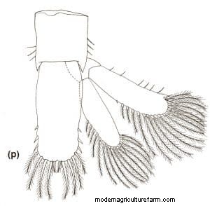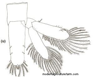 Telson and Uropods: Exopod with five simple and one plumose setae on dorsal margin; one spine and two serrated setae terminally; rounded by 22–24 plumose setae. Some small setae hair-like and plumose setae present between terminal spines and the set of plumose setae. Endopod with 20–23 plumose setae.
