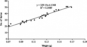 The number of eggs depends on the weight and size of the female. The bigger is the female the more eggs she can carry. It ranged from 21-51 shrimplets per hatching, increased linearly (R2 = 0.9587) with the size of the female.