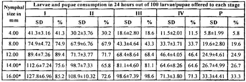 Note: dragonfly or damselfly nymphs are carnivorous hunters from the start. According to the study, it was observed that nymph of 14 and 16mm size consume more than 100 mosquito larvae, between inter-molt stages. The predation rate of the nymph increases along with the size of the nymph. (*Laboratory studies on the predatory potential of dragon-fly nymphs on mosquito larvae. Article in The Journal of communicable diseases. July 2003)