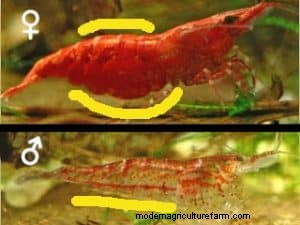 If we are talking about the most popular cherry shrimp. The sex determination of the Red Cherry Shrimp is quite obvious when they are 2 months old. The females are larger compared to the males, have a more intense red coloration, and also have a curved abdomen. The male shrimp have a very pale red coloration and has a straight lateral line with no curved forms.