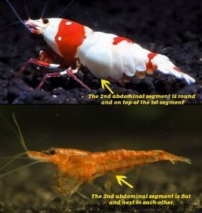 Females of the dwarf shrimp tend to have bigger and rounder underbelly (abdomen) whereas the males do not have a curved abdomen. It has a more-like triangular or straight shape. Males do not need the extra space underneath to store their eggs.