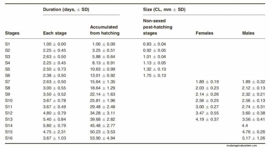 When the female gonads are fully developed, the “pre-mating molt” occurs and it is followed by mating. The first female with embryos was recorded 49 days after hatching (55.18 ± 4.46).
