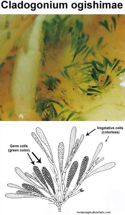 - Cladogonium ogishimae stays on the bottom of the shrimp.