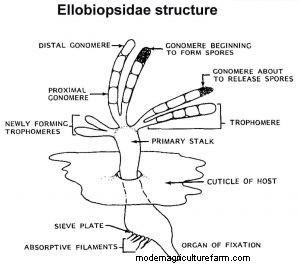 It is multinucleate parasites of aquatic crustaceans that possess a nutrient absorbing “root” inside the host and reproductive structures that protrude through the carapace. Ellobiopsidae have variously been affiliated with fungi, “colorless algae”, and dinoflagellates, although no morphological character has been identified that definitively allies them with any particular lineage.
