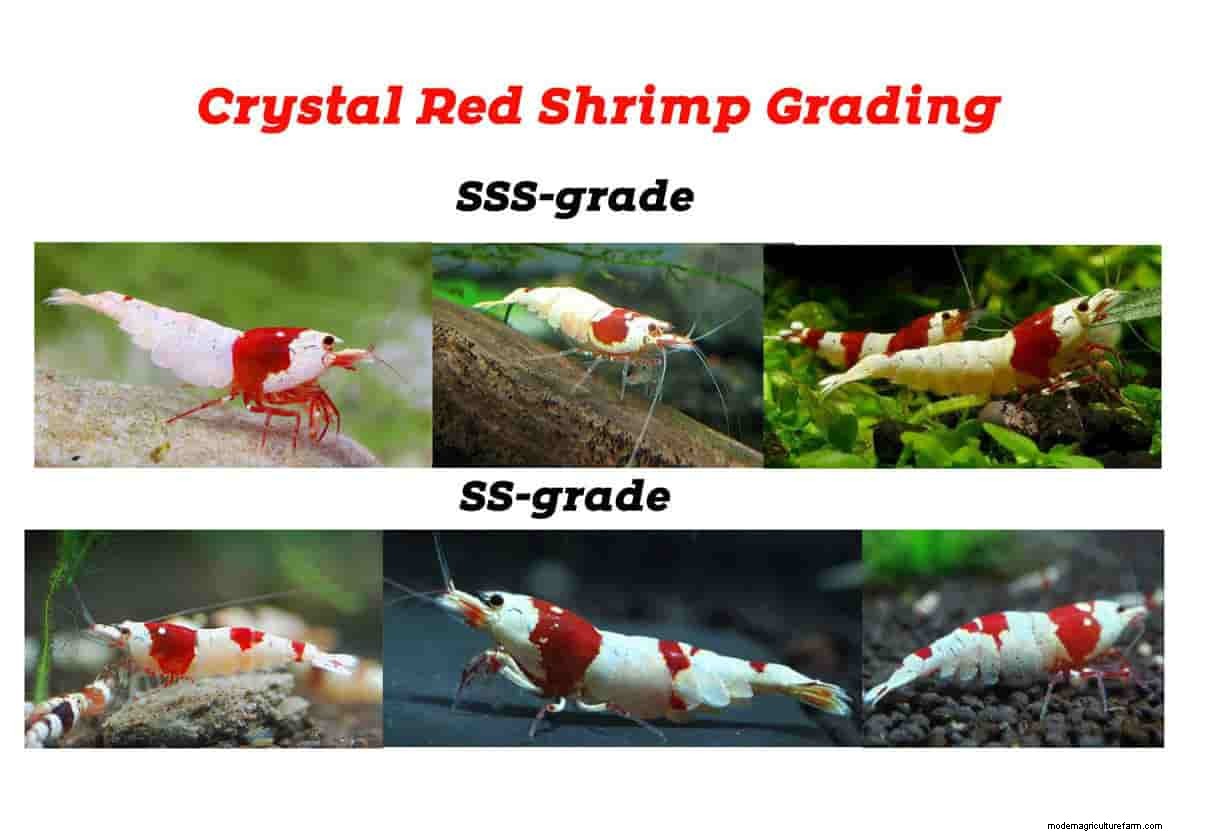 Pattern grading is based on the amount of white vs. red or black. The more white color, the higher the grade the shrimp is. The grades go from C grade (lowest with the most red or black color) to SSS+ (the highest grade with the least amount of red or black). In order from least to greatest: C, B, A, S, SS, SS+, SSS, and SSS+.
