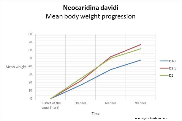 The results after 30 days showed that shrimp from D2.5 and D5 groups started increasing their weight at a higher rate compared to D10. The difference between D2.5 and D5 groups was within the margin of error.
