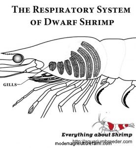 Dwarf shrimp breaths with the help of gills. There are several different morphological types of the gills: dendrobranchie, tricobranchie and fillobranchie. For example, the Caridina and Neocaridina have fillobranchie.
