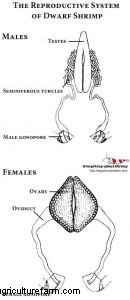 In female sexual mature shrimp, there are the paired ovaries, in which the eggs are produced. It is easy to see them beneath the heart if the shrimp is transparent. The paired ovaries aquarists usually call a “Saddle”. This is the only indicator of shrimp gender, which can guarantee the difference between males and females. The matured eggs remain near the margin and the immature eggs occupy the center.