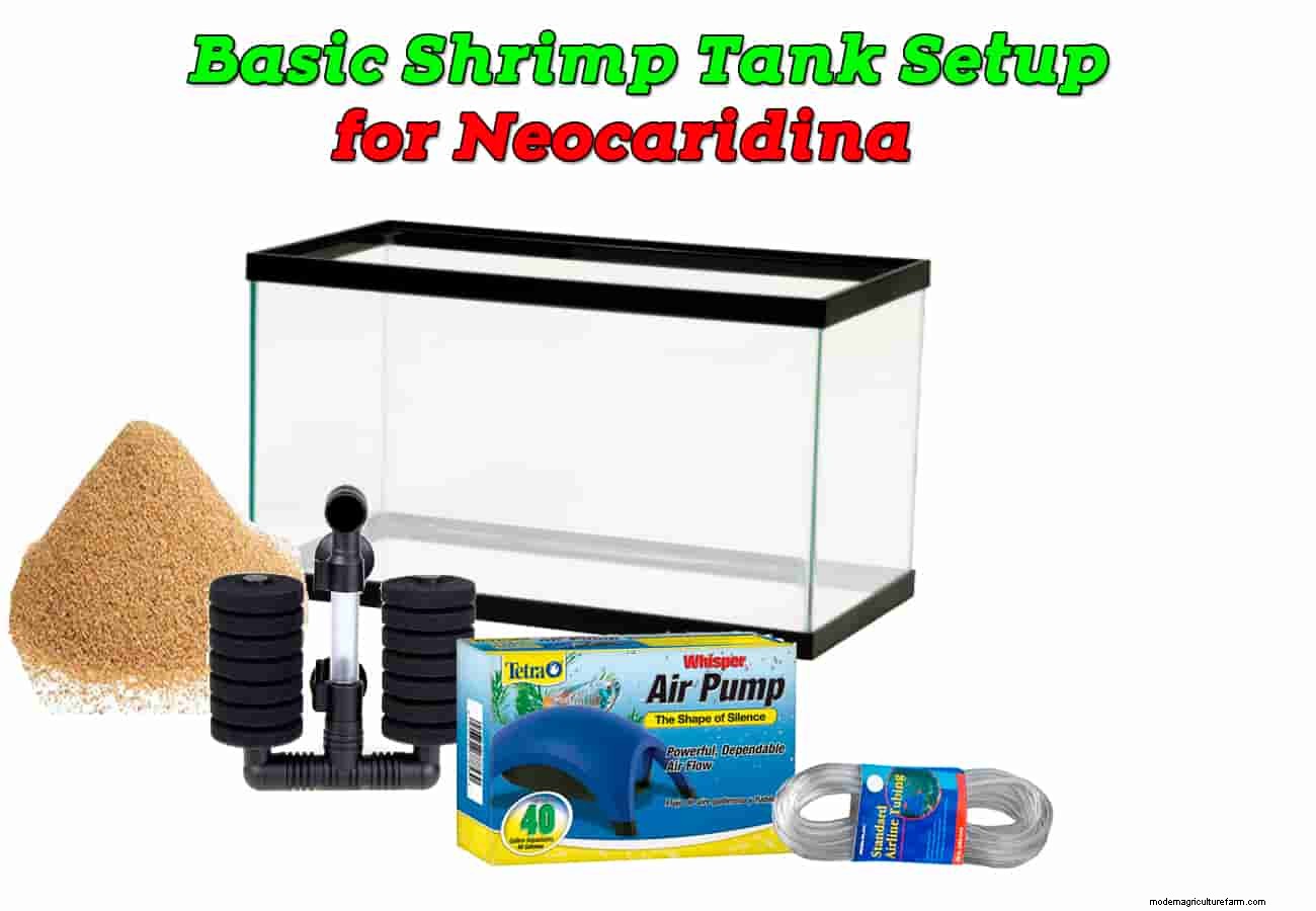 In short. Neocaridina Shrimp do not require a lot when it comes to aquariums. Therefore, to set up a shrimp tank you need to add 2-3 cm (~1 inch) of an inert substrate to the bottom of the tank. Then, install an aquarium filter and air-pump. Fill it with water. Wait until the nitrogen cycle finishes. Add dwarf shrimp.