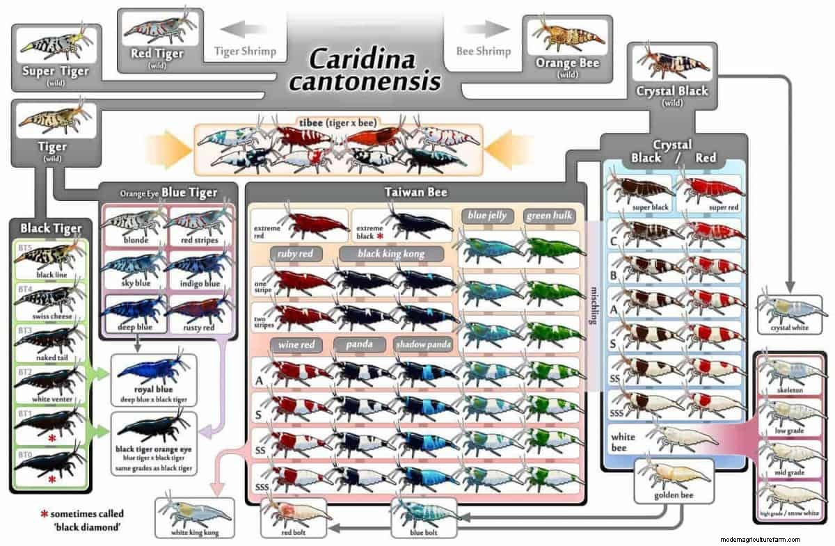 Red Bee shrimp, Red Tiger shrimp, King Kong, Taiwan bee, and many others |