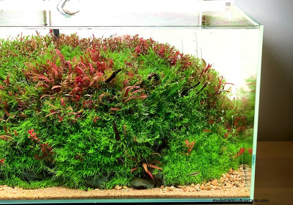 Speaking of the area at the front of the tank- why not just stop the aquasoil a few inches from the glass and use sand instead? Cosmetic sand adds a nice dash of brightness to the otherwise green and brown environment and helps to cordon off a section of the tank for aquarium fish and shrimp that won’t become overgrown. The light color provides a great contrast to the colors of the fauna and the aquatic plants.