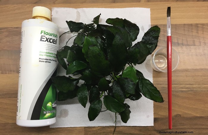 What? How to brush off the BBA from an Anubias plant? Well, the method is peaty simple. You will need Flourish Excel (buy it from Amazon) and a small brush for this.
