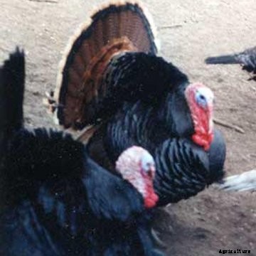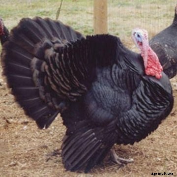 The plumage of this variety is a lustrous, metallic black with a greenish sheen on top and a dull black undercolor. It is undesirable to have a brownish or bronze cast or any white. Poults will often have white or bronze in their feathers but molt into mature plumage. The beak is black, the wattle is red, changeable to bluish-white, and the shanks and toes are pink in adults. Eye color is dark brown. Skin of the Black turkey is usually white.