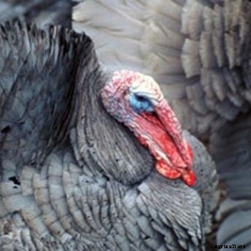 The Slate or Blue Slate variety is named for its color, which is solid to ashy blue over the entire body, with or without a few black flecks. It is also called the Blue or Lavender turkey. Hens are lighter in hue than the toms. The head, throat, and wattles are red to bluish white. The beak is horn in color; the eyes are brown; and the beard is black. The shanks and toes are pink.