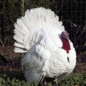 The White Holland turkey is showy in appearance, with snow white feathers and a red to bluish head. The beard is black, the beak is pink to horn colored and the throat and wattles are pinkish-white. Shanks and toes are pinkish-white, and eyes must be brown. The Standard weight for a young tom is 25 pounds and 16 pounds for a young hen.