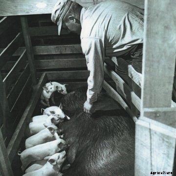 The November 1964 issue of Successful Farming magazine featured a story on the Mulch brothers, Roger and Richard, of Hancock County, Illinois, who were pioneers in using slatted floors in hog barns. The brothers designed and built a 40-stall farrowing house in 1961 that featured slats and zone ventilation.