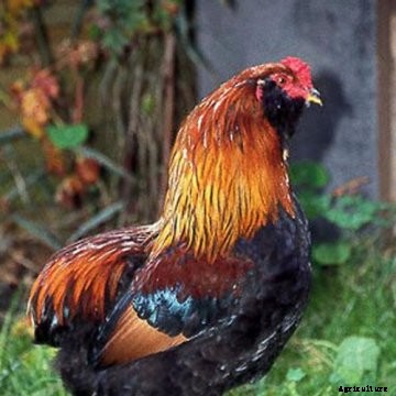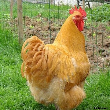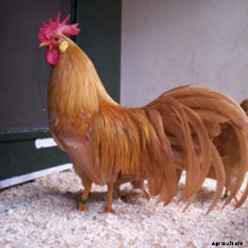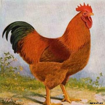 They possess a deep, broad body, grow feathers very rapidly, are prone to go broody and make good mothers. Their color is a medium to light red and often fades in the sunshine. The comb is single and medium to large in size; in the females it often lops over a bit. These medium sized meat chickens have fair egg laying ability and are competitive and aggressive.