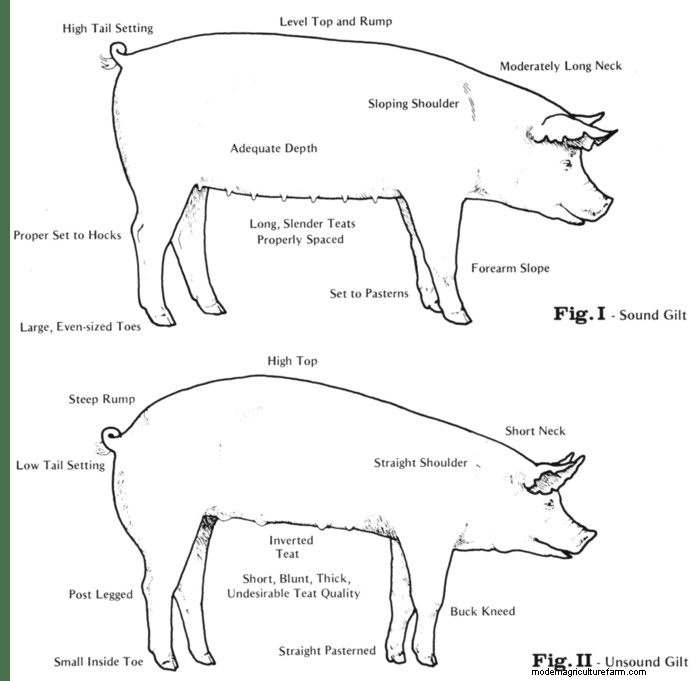 The material that, the desirable breeding stock must be structurally sound. They need a sloping shoulder, forearm, and pastern to serve as front shock absorbers. Also, a level rump, high tail setting, and hock angulation. There also must be a spring or flexion (proper set to hock joint) for rear leg soundness. Additionally, a level top, moderate length of neck, and large, even-sized toes aid structural soundness. Breeding swine need to move soundly and freely on pasture, or in confinement. Sows must be able to get up and down in farrowing crates. Boars must be sound to service sows.